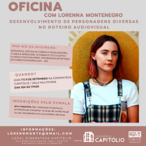 A Cinemateca Capitólio, em sua sala multimídia, recebe nos dias 07 e 08 de setembro a OFICINA – DESENVOLVIMENTO DE PERSONAGENS NO ROTEIRO AUDIOVISUAL, ministrada por Lorenna Montenegro.