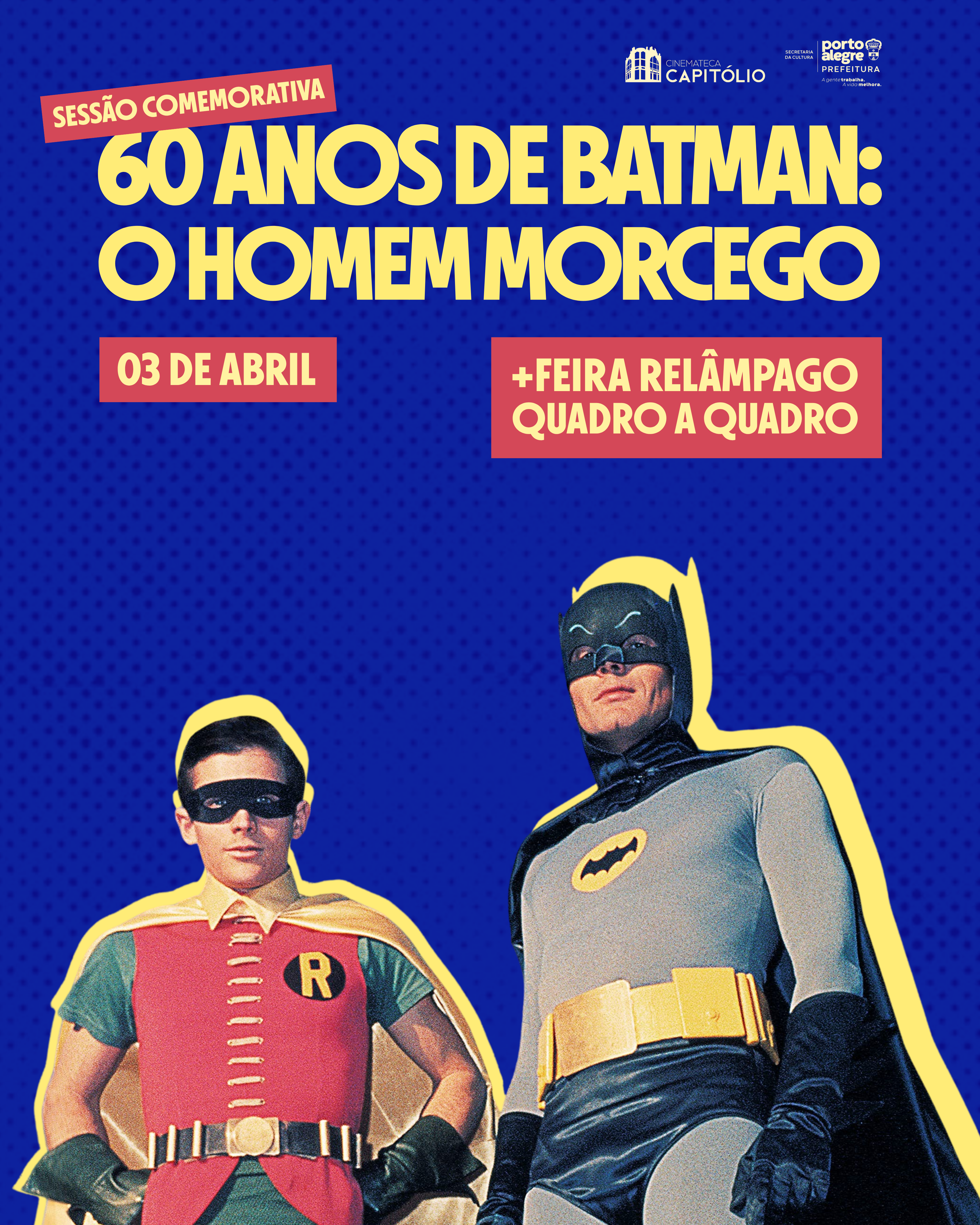 Na sexta-feira, 03 de abril, a Cinemateca Capitólio convida o público para uma noite especial dedicada a uma das produções mais icônicas da cultura pop. Às 22h, acontece a Sessão Comemorativa de 60 anos de Batman: O Homem Morcego, dirigido por Leslie H. Martinson, resgatando o espírito vibrante, colorido e irreverente do Batman dos anos 1960.